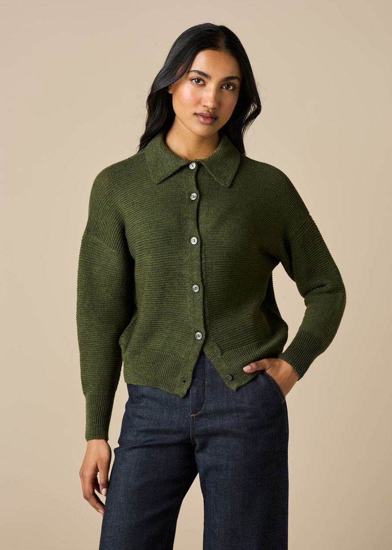 UIMI - Pearl - Garter Stitch Australian Merino Wool Cardigan with Collar - Moss