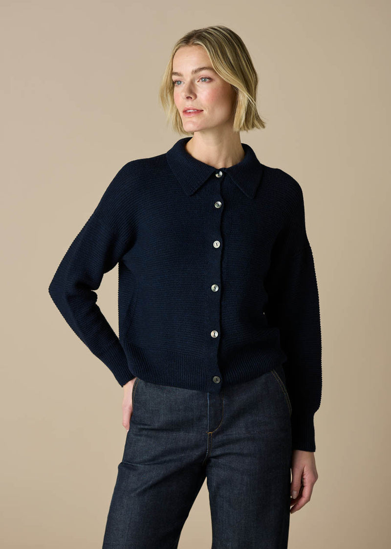 UIMI - Pearl - Garter Stitch Australian Merino Wool Cardigan with Collar - Midnight