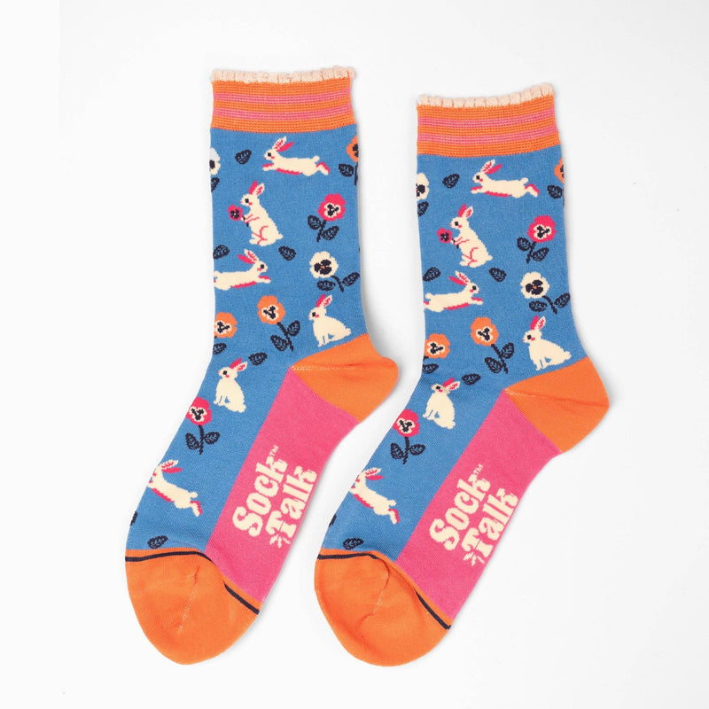Women's Bamboo Socks - Blue, Rabbit and Flowers